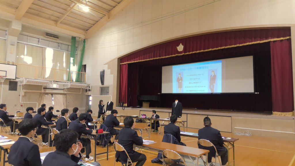 洋服の青山の職員の方二名に、外部講師としてお越しいただき、スーツの着こなし方や身だしなみの基本、お辞儀等のマナーについて学びました。また、男女別に分かれて、ビジネスメイクやスキンケア、ヘアセットの説明も受けました。